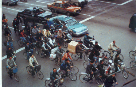 Noch immer ist China eine Nation von Radfahrern - wenn auch Motorrad und Auto aufholen. Szene vom Innenstadtzentrum Xu Jia Hui. |