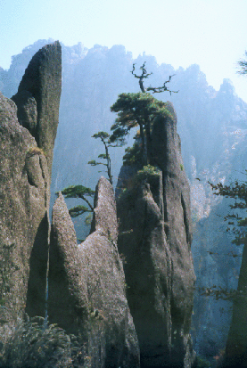 Bizarre Felsformationen, Pinien auf winzigen Absätzen über gähnenden Abgründen, die beiden Markenzeichen der Gelben Berge |