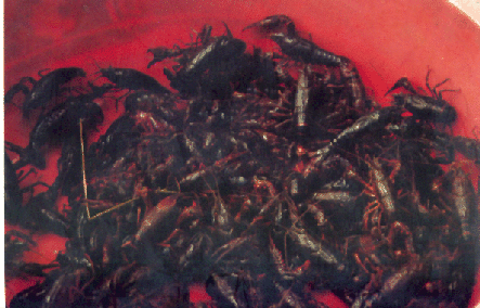 Flusskrebse auf dem Markt in unserem Compound - 2009 sind Flusskrebse in Shanghai mega-angesagt. Ein Flußkrebshotpot ist wirklich eine wahre Freude. Wie alle Schalentiere färbt sich der Flußkrebs beim Kochen appetitlich rot.