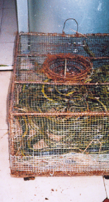 Käfig mit sehr vielen unterschiedlichen Schlangen vor einem Restaurant in Guilin