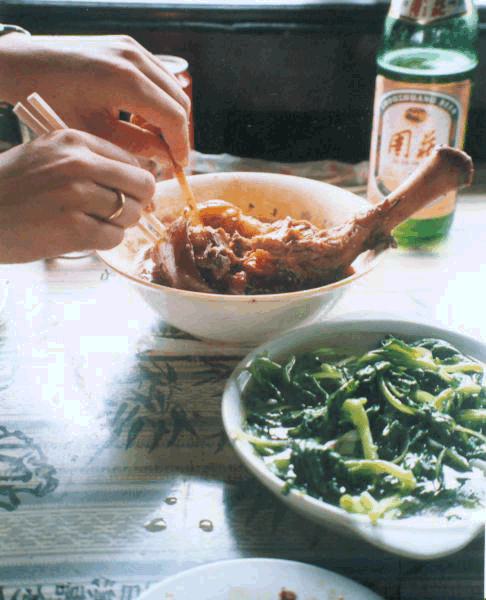 Festmahl in Zhouzhuang, die berühmte marinierte Schweinshaxe, dazu Winterkohl mit viel Knoblauch und ein einheimisches Bier. Auf dem folienbespannten Tisch vielleicht keine Augenweide, eine Gaumenfreude in jedem Fall ;-)