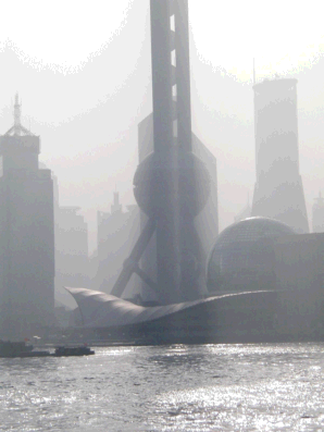 Unwirklicher Eindruck morgens um Sieben: Pudong im Dunst |