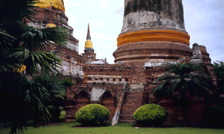 Die mächtigen Strukturen dieses Nebenchedi verdeutlichen erst die Dimensionen des links daneben aufsteigenden Haupttempels vom vorhergehenden Bild. Auch hier sieht man im übrigen wieder, wie sich in der Folge verheerender Hochwasser Teile des Bauwerkes abgesenkt haben. Eine große Bedrohung für eine ganze Reihe von Kulturschätzen in der Umgebung Bangkoks |