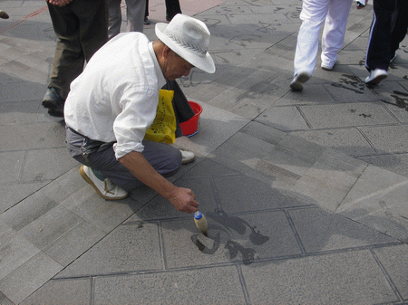 Auch in Guiyang beliebt: Die vergängliche Wasser-Kalligraphie. Er - ein Meister. |