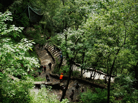 Die von Stelen und Stupen gesäumten steinernen Treppen zum Hongfu-Tempel