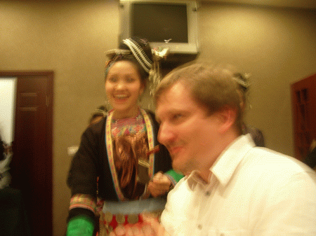 Eine Dong-Sängerin (und das halbe Restaurant) freut sich, dass ich auf der Hochzeitsfeier von Freunden meiner Gastgeber nach ca. 100 Moutai und nochmals 5 Reisweinhörnern ein mit zwei Stäbchen dargebotenes Leckerchen dann doch erst beim zweiten Bissen erwische - dem Fotografen wäre es wohl nicht besser ergangen... :-). |