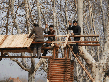 Chinesische Freundlichkeit: Gut gelaunte Arbeiter in einem Park. |