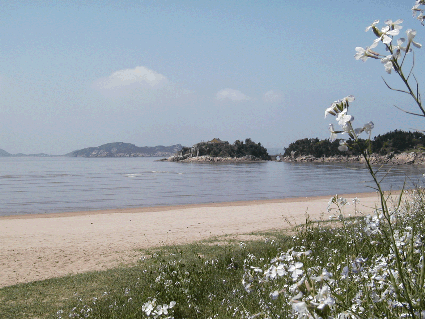 Am Strand direkt vor unserem Hotel. Auf der kleinen Tempelinsel im Zentrum findet sich in malerischer Umgebung das “Südliche Himmelstor” |