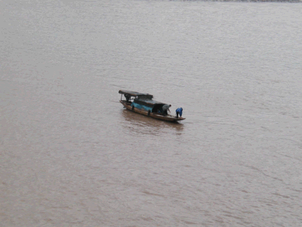 Fischer auf dem Yangtze. Das Boot hat einen Motor, ist aber sonst noch traditionell aus Holz gefertigt. |